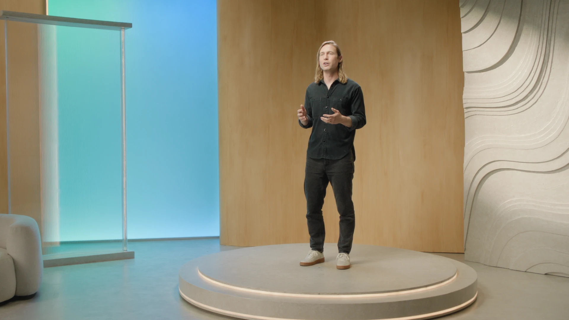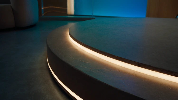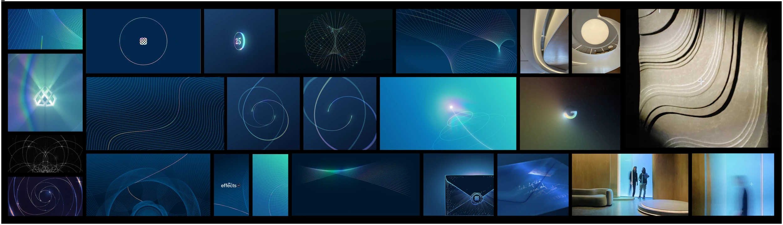 We wanted the set design to feel timeless, rooted in what we called bright brutalism—essentially a balance of strong, bold materials and warm, inviting details that harken to the sturdiness of finance and the optimism of technology. Our floating graphics and motion used light and colors to communicate insights, creating a space that felt both dynamic and approachable. To do this, we wanted to mix dark tones with wood, concrete, glass, and LED screens, while using under-lighting to add depth and contrast. External elements, like furniture, should be stylish and carry a distinct point of view without feeling overly trendy, reinforcing the tactile and human-centered qualities of Soft Brutalism.