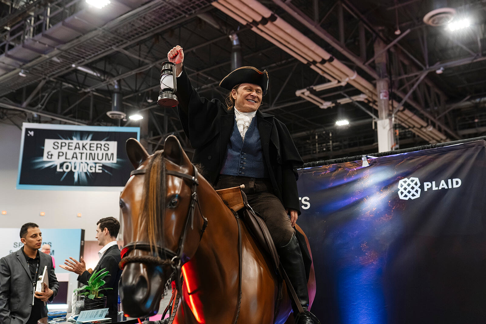 Using generative AI in partnership with real artists, we developed a series of oil-paintings featuring famous figures from currency. They appeared on billboards around the country announcing new Plaid products. Our most successful placement was an oil-painted Paul Revere warning Plaid customers about the looming threat of fraudsters, a real threat to digital finance who are now armed with the deadly tools of machine learning. We used generative AI to create the portrait before commissioning muralists to paint Paul for real, displaying him on buses, billboards, and some of the largest ad units around the world, including Resorts World Las Vegas. To complement the campaign, we hired a Paul Revere impersonator to ride through Money 2020, warning our customers in real-time. The outcome was surprisingly successful, allowing Plaid to rise above the noise during a busy time for fintech.